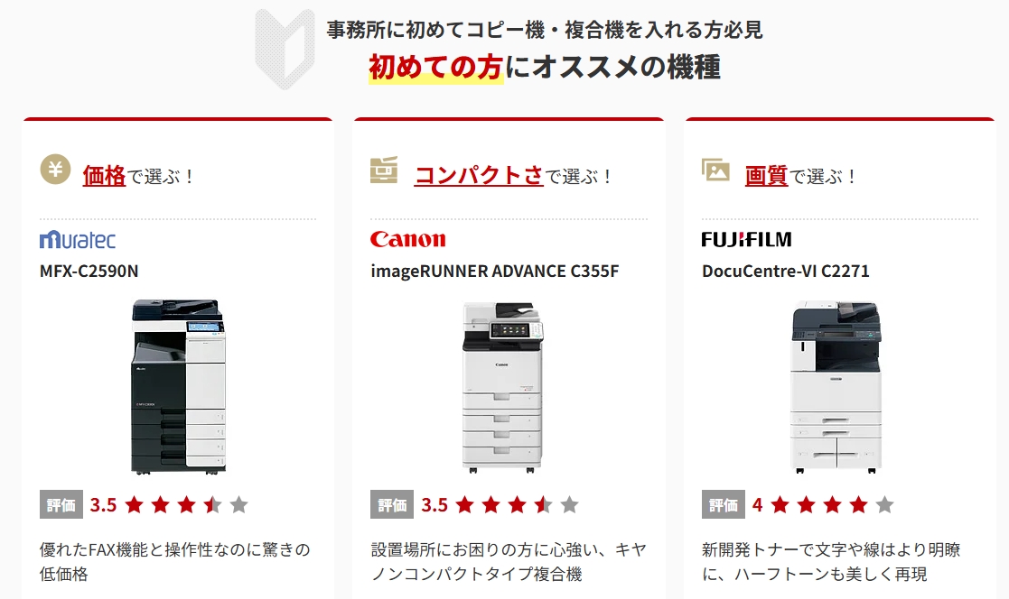 コピー機ドットコムでは、複数メーカーの機種を比較検討できるのも強み。
